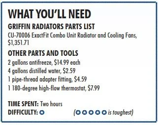 Companies such as Griffin have staked a reputation on making the best American-built aluminum radiators on the market today. What’s more, they offer an ExactFit line, which will bolt in place of your factory unit, use the same-style hoses and fittings, and provide a serious boost in cooling power over your old brass/copper unit.